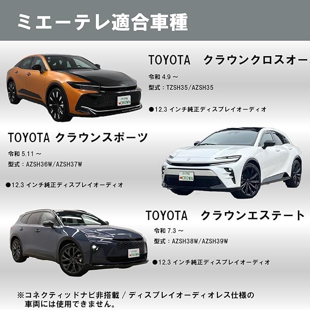 【適合車種】トヨタ クラウン クロスオーバー 35系 型式:TZSH35 / AZSH35, クラウンスポーツ 36/37系 型式 : AZSH36W / AZSH37W, クラウンエステート 38/39系 型式 : AZSH38W / AZSH39W(コネクティッドナビレス車を除く)