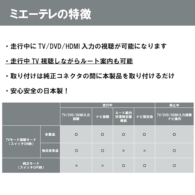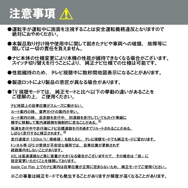 【注意事項】①本製品は付属スイッチの切替により映像の視聴が可能になります②本製品を取り付けた状態でも車検に適合します③ナビゲーションの通常機能(バックカメラやETC等)に影響はございません④テレビ受信、DVDの再生機能がない車両では機能しません。事前にご確認ください⑤取り付け等のサポートは対応しておりません⑥初期不良等の不具合は、購入後30日以内にご連絡ください、交換・返品にて対応いたします。30日以降は1年保証ですので、修理・交換対応にて対応いたします。交換・返品に伴う製品の取り付け・取り外し等の費用については弊社で負担いたしかねます