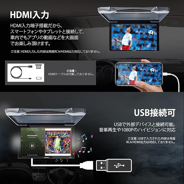 【フリップダウンモニター★HDMI機能対応】HDMI入力端子搭載だから、スマートフォンやタブレットと接続して、車内でもアプリや、動画、インターネットなどを大画面でお楽しみ頂けます。♪(ご注意:HDMIケーブルは付属しておりません。)★★ご注意:HDMI入力した内容は再度RCA/HDMI出力対応しておりません。USBデバイスで入力された内容は再度RCA/HDMI出力は対応しておりません。★★