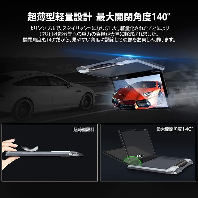 【フリップダウンモニター★140度水平オープン可能】よりシンプルで、スタイリッシュになりました。軽量化されたことにより取り付け部分等への重力の負担が大幅に軽減されました。開閉角度も140°だから、見やすい角度に調節して映像をお楽しみ頂けます。