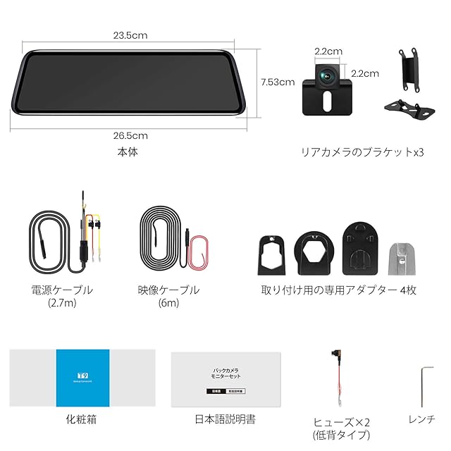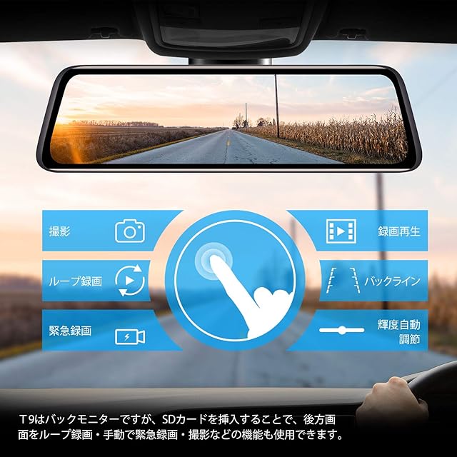 【バックミラー機能だけではない】①車両後方の道路状況をリアルタイムで表示し、高く積み重なった荷物・背の高い乗客・車両の設計などの障害物によって妨げられることはありません。②バック時に映像内にガイドラインを表示して運転をサポートします。ガイドラインは使いやすい角度や位置に調節することが可能です。バックが苦手な方も安心!③T9はバックモニターとしての優れた機能だけなく、SDカードを挿入することで、後方画面を常時録画・手動で緊急録画・撮影などのも可能です。④更に、SDカードとGPSアンテナを両方とも挿入する場合、運転中の走行速度、走行方向を録画データと共に記録できます。ご注意:GPSアンテナは付属されていないので、別途購入必要があります。GPSアンテナASIN:B08B1GBCP8