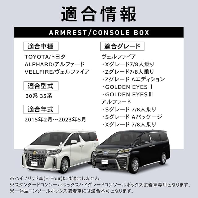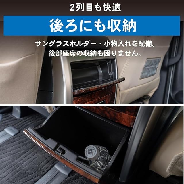・POINT.1 「抜群の収納力」 収納ボックスは縦32.5cm 横11.5cm 深さ22.5~43.2cmの大容量。 散らかる小物から、ティッシュボックスなど大きなモノまで入ります。 開閉式のドリンクホルダーを2つ配備しているので置き場に困りません。 ・POINT.2 「後ろにも収納 」 サングラスホルダーと小物入れを配備。 後部座席の収納も困りません。 ・POINT.3 「ジャストフィット」 アルファード ヴェルファイア 専用設計なので 運転中のグラつきはほぼありません。