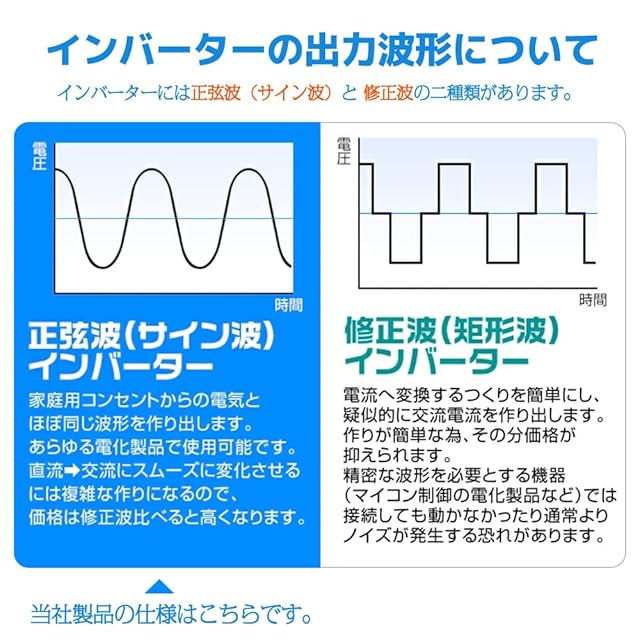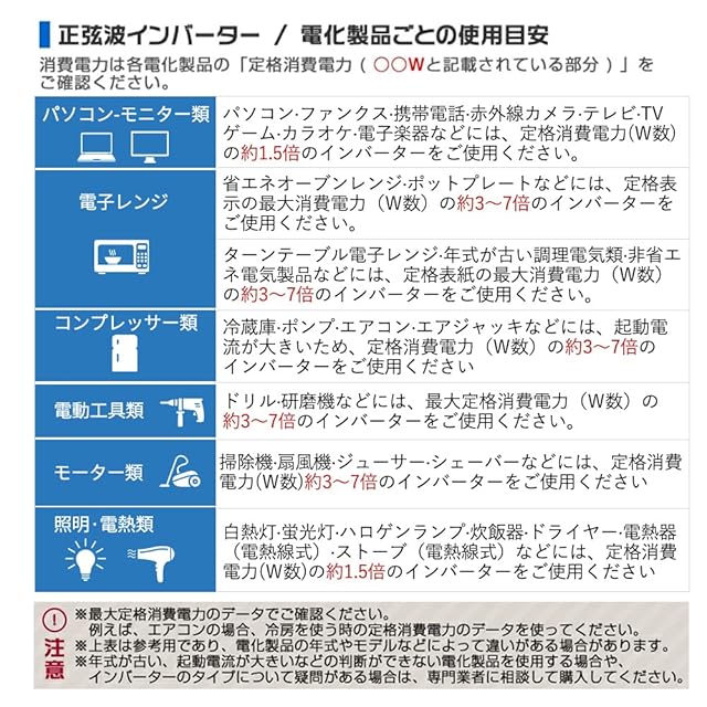 【※注意事項※】※本製品はDC12V専用です。DC24Vには使用できません。※誘導型電化製品(電子レンジ、ポンプ、扇風機など)をご使用の際は、消費電力の3倍から7倍程度の余裕のある正弦波インバーターをお選びください。※端子とワイヤーが確実に接続されていることをご確認ください。そうしないと、ワイヤーや端子の過熱や溶解が起こる可能性がございます。※バッテリーの容量が十分であることをご確認ください。容量の小さいバッテリーをご使用になりますと、AC出力電圧が急激に低下し、インバータのAC出力が停止いたします。1500Wの電化製品をご使用の場合は、100AH以上のバッテリーが必要でございます。※高温、多湿、ホコリの多い場所での保管、設置はインバータ内部のショートの原因となりますので、ご注意ください。