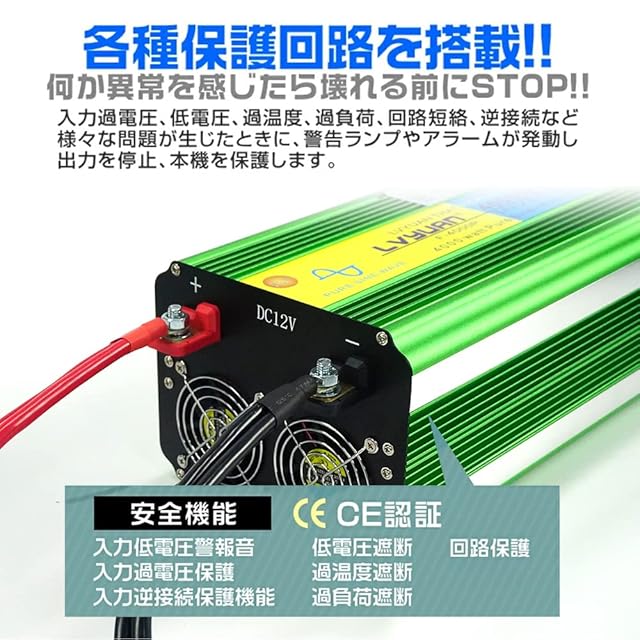 【純正弦波】 LVYUAN 4000W 12Vインバーターは、家庭用AC100Vの出力波形と一致する純正弦波となっております。出力波形が必要とされる正弦波電化製品にご使用いただけます。また、モーターなどの誘導負荷がある電化製品にもご利用いただけます。インバーターは、4つのソケットを備えており、それは家庭の壁コンセントと同様の仕様となっております。各ソケットの出力は1500Wでございまして、4つのソケットの合計出力は4000Wです。バッテリー端子には絶縁保護カバーが装備されており、ご使用時の安全性を高めております。※ご使用に際しては、電化製品の電力にご注意くださいませ。1500W以上の電化製品をご使用する必要がある場合には、当社のUPS低周波インバータまたはハイブリッドソーラーインバータをお選びいただけますようお願い申し上げます。
