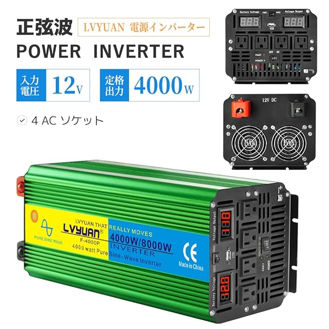 【仕様】入力電圧:DC12V(11-15.5V) 出力電圧:AC105V±5% 定格出力:4000W、瞬間最大出力(1S):8000W、5V/3.1AのUSBソケット×1、ACコンセント×4、出力波形:正弦波。