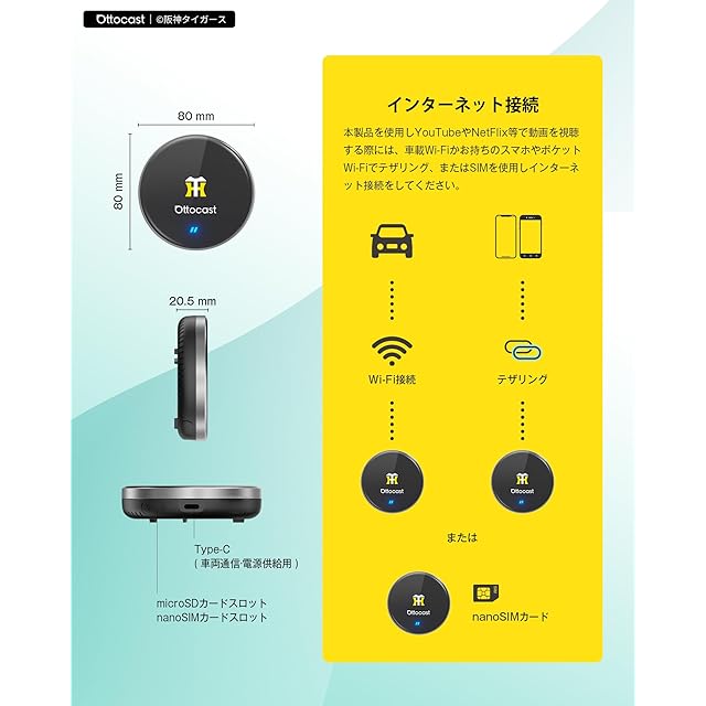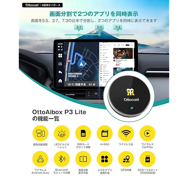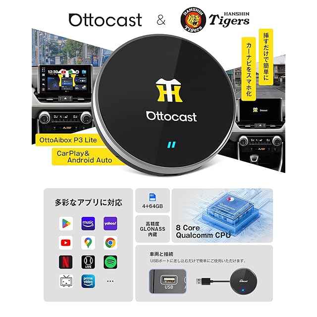 【公式】オットキャスト P3 Lite OttoAibox P3 Lite CarPlay ai box 阪神タイガース限定デザインモデル 純正有線CarPlayをワイヤレス化 Android12搭載 4GB+64GB YouTube/Netflix/ABEMA見れる 車内動画視聴可能 ワイヤレスCarPlay&Android Auto対応 技適取得済み【阪神タイガース公式コラボモデル】