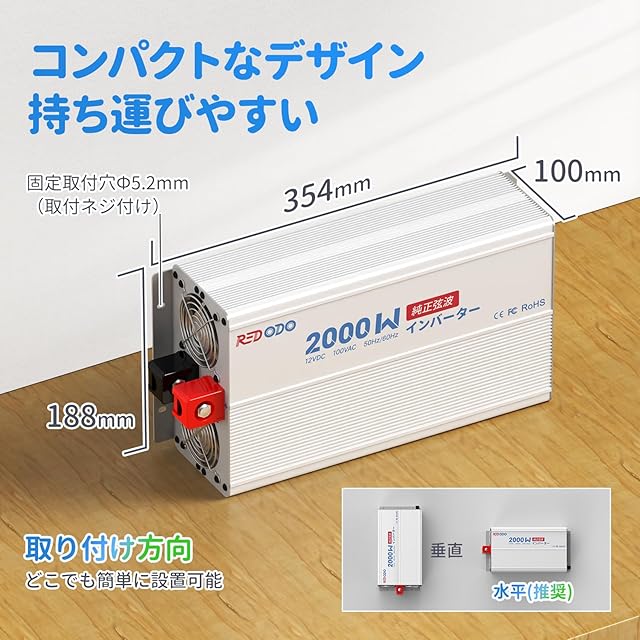 【簡単な設置】Redodo 2000Wインバーターは、電子レンジやコーヒーメーカーなど、日常のさまざまな家電製品に対応可能。10.0Vから15.5Vのバッテリー電圧を受け入れ、特にRedodoの12V LiFePO4バッテリーとの相性が抜群です。縦置き・横置きのいずれでも簡単に設置できます。