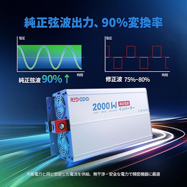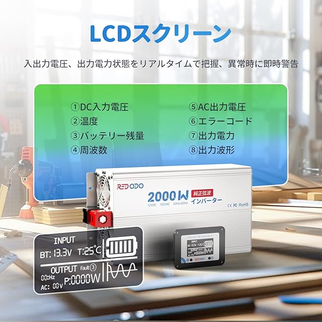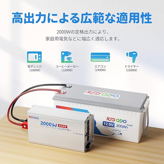 Redodo 2000W インバーター 純正弦波 12V DCから100V AC変換 高効率90% ピーク4000W LCDモニター搭載 LiFePO4バッテリー対応 過電圧・過負荷保護機能 RV キャンプ 災害グッズ 太陽光発電