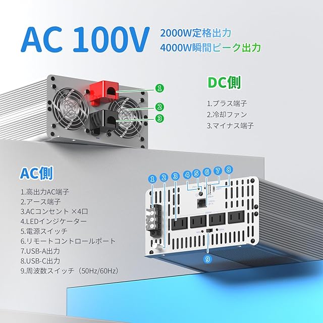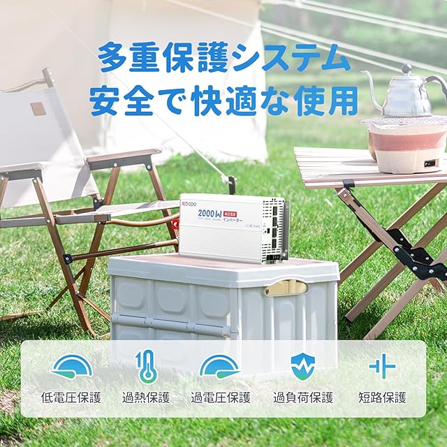 【充実の安全機能】Redodo 2000Wインバーターには、冷却ファンを内蔵し、過電圧、低電圧、高温、過負荷の保護機能を備えています。安心して毎日の電力供給に使用でき、スイッチひとつで電源のON/OFFを簡単に操作できます。※バッテリーとインバーターの接続時は、プラスとマイナスを逆にしないようご注意ください。また、設置時はインバーターをオフにしてください。