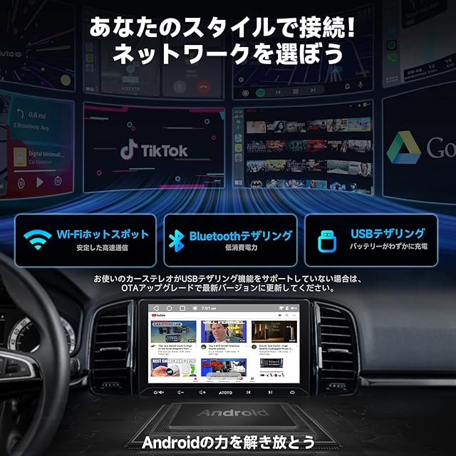 インターネット接続オプション:Wi-Fiホットスポット、Bluetoothテザリング、またはUSBテザリングからお好みの方法を選択してインターネットに接続できます。快適なスマートドライビング体験を楽しみ、シームレスなインターネット接続でOTA(無線)アップデートを受け取りましょう