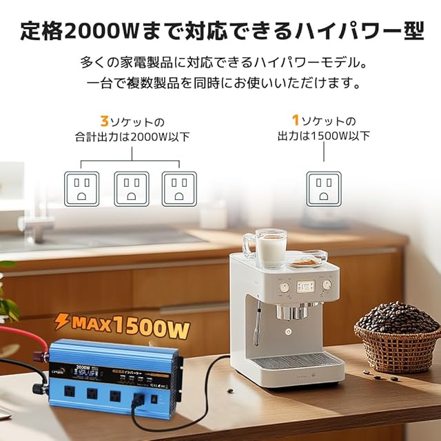 ※仕様 定格出力:2000W 入力電圧:DC12V(11-15V) 出力電圧:100V±5V 出力周波数 : 50Hz·60Hz ひずみ率:<3% 効率:>88% 電圧計 :入力電圧、出力電圧 低バッテリアラーム:DC10V±0.5V 低バッテリシャットダウン:DC 9V±0.5V 高バッテリシャットダウン:DC 15.5V 稼働温度:0〜45℃ 高温保護>75℃ 商品重量 :2.6kg 製品サイズ :345mm*158mm*93mm※附属品: 2x 25Sqバッテリー接続クリップ 6×ヒューズ 日本語取扱説明書 50m以内で操作可能なリモコン機能付き。屋外使用に便利。電池(12V 23A)は別売り。