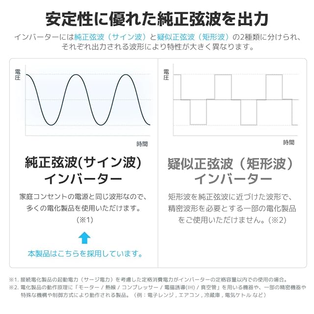 高性能の純正弦波インバーター:家庭のAC100V電流波形は図のような規則正しい正弦波形です。ほとんどの電気製品で使用可能です,精密機器もOK!