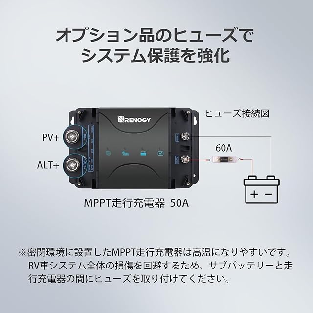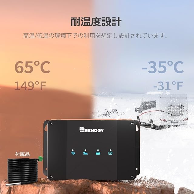 【新しく進化してさらに安全に!】 ソーラー入力電圧が25Vから50Vに向上し、重量と寸法も最適化。新たな「低電流カットモード」により、7A未満のソーラー出力時には自動で走行充電に切り替え、効率的かつ安全な充電を実現。