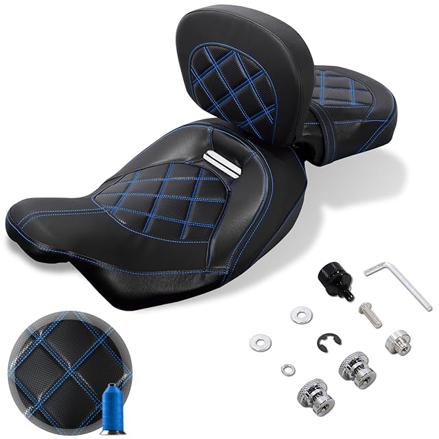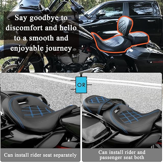 [ライダー背もたれ付きツーアップシート]ダブルブルーステッチレザーロープロファイルドライバー助手席ピリオンシート+調節可能なライダードライバードライバーバックレストパッドキット ハーレーツーリング CVO ロードグライド ロードキング ストリートグライド エレクトラグライド FLHR FLTRX FLHX FLHTウルトラリミテッド CVO ウルトラクラシック FLHTCUSE5 2009年以降、トライクモデルには適合しません。