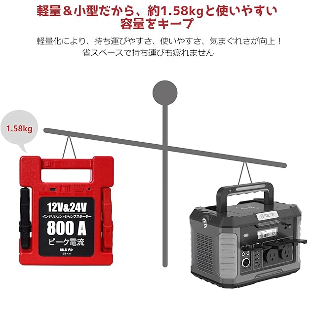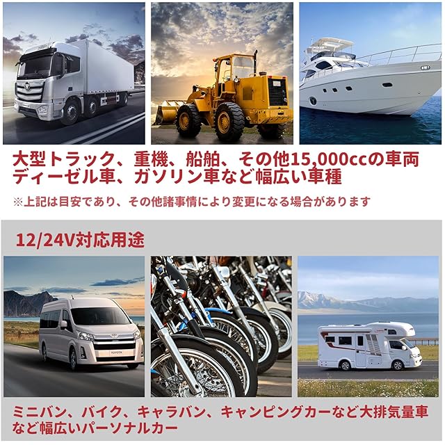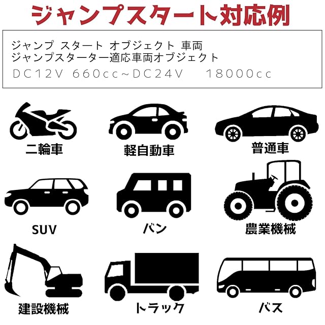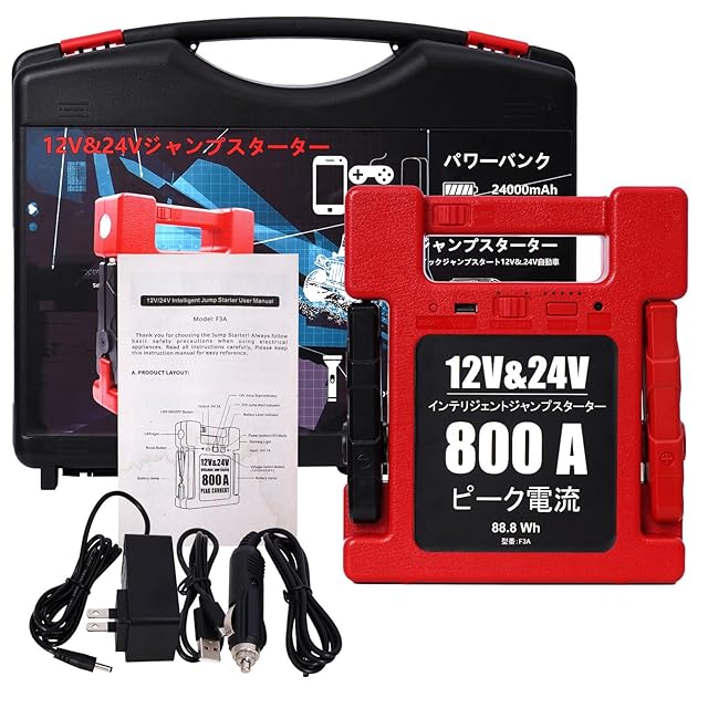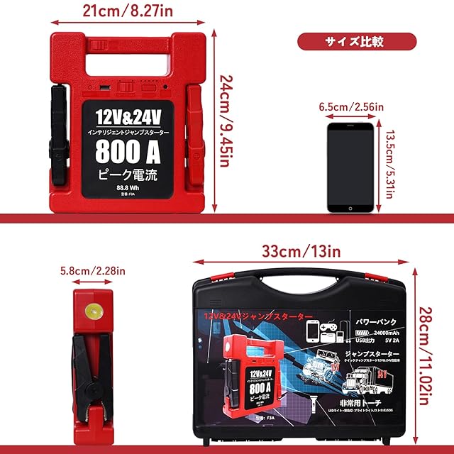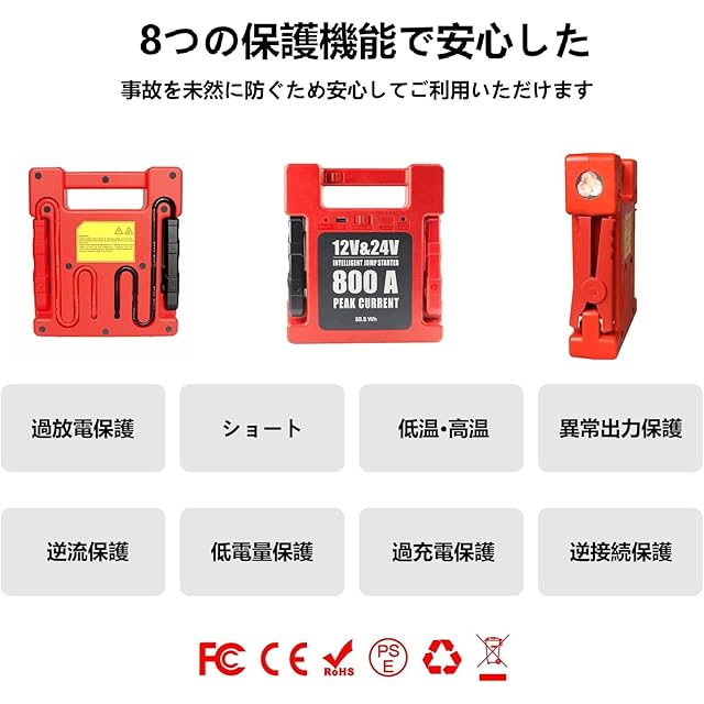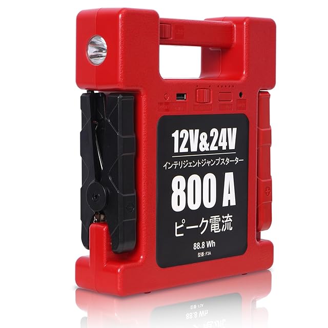 ジャンプスターター:ピーク電流800 Aで12 V車 24 V車 どちらも対応!軽自動車・乗用車・トラックまですべてスタート可能!(V10 6L 、V10 4L MAX)などは一発でエンジンがかかります。