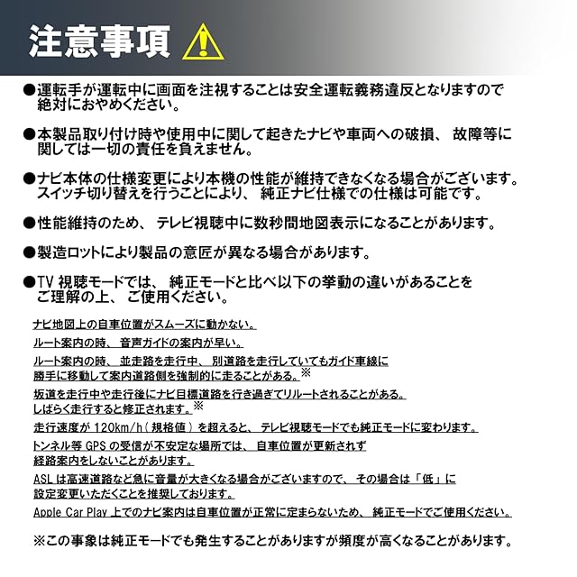 【注意事項】①本製品は付属スイッチの切替により映像の視聴が可能になります②本製品を取り付けた状態でも車検に適合します③ナビゲーションの通常機能(バックカメラやETC等)に影響はございません④テレビ受信、DVDの再生機能がない車両では機能しません。事前にご確認ください⑤取り付け等のサポートは対応しておりません⑥初期不良等の不具合は、購入後30日以内にご連絡ください、交換・返品にて対応いたします。30日以降は1年保証ですので、修理・交換対応にて対応いたします。交換・返品に伴う製品の取り付け・取り外し等の費用については弊社で負担いたしかねます