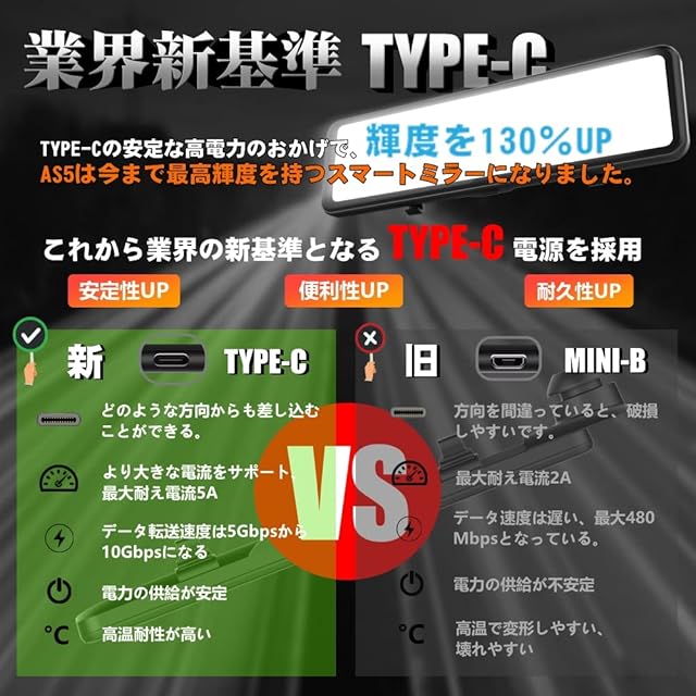【Type-C電源を採用で、液晶は今まで最高輝度に、昼中の視認性UP】業界の新基準となるType C端子の電源を採用しました。電源が落ちる、高温変形、耐久性がないの一般的なUSB miniB端子の問題を完全に解決しました。他のUSBには挿入向きがあり、差し込むたびに向きを確認する必要がありますが、Type Cは向きを確認せず利用できるのでストレスになりません。このような安定した電力供給とプラグバックの特性は、より良い体験により、将来の標準装備となります。Type-Cの大電力のおかげで、液晶輝度は従来より130%引き上げ、透過率70%の高品質ガラススクリーン連携して表示の見やすさと昼中の映り込みが圧倒的に改善されます。夜間の眩しさも防止できます。二つの駐車監視モード(専用駐車監視ケーブル必要):①タイムプラスモード:駐車中1フレーム/1秒、4フレーム/1秒のタイムプラス映像で録画します。②衝突感知モード:駐車中に衝撃などを検出して自動録画します。