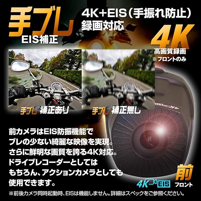 【4K高画質録画で手ブレ補正機能付き前後同時録画バイク用ドライブレコーダー】大容量バッテリー内蔵なので4K画質で約5時間連続撮影が可能。高度なビデオEIS機能でブレの少ない綺麗な映像を実現。前後同時録画であおり運転も安心のヘルメット装着型ドライブレコーダー。※EIS(手ブレ補正)は前方1カメラのみの使用時のみ設定可能です。前後2カメラ使用時は使用できません。