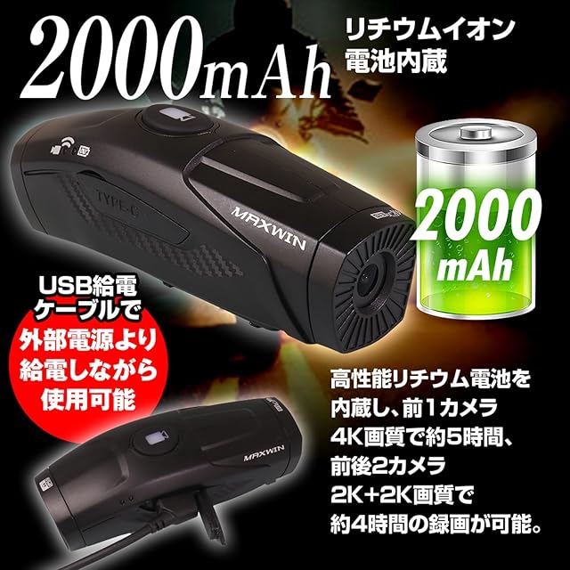 【2000mAh リチウムイオン電池内蔵】 高性能リチウム電池を内蔵し、前1カメラ4K画質で約5時間、前後2カメラ 2K+2K画質で約4時間の録画が可能。 2A急速充電にも対応。