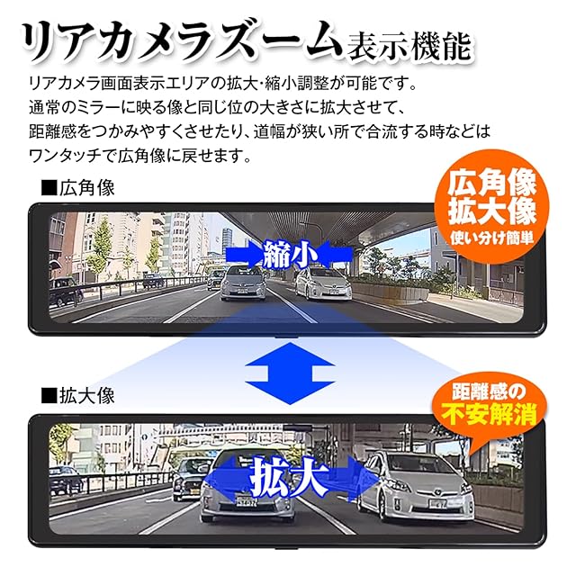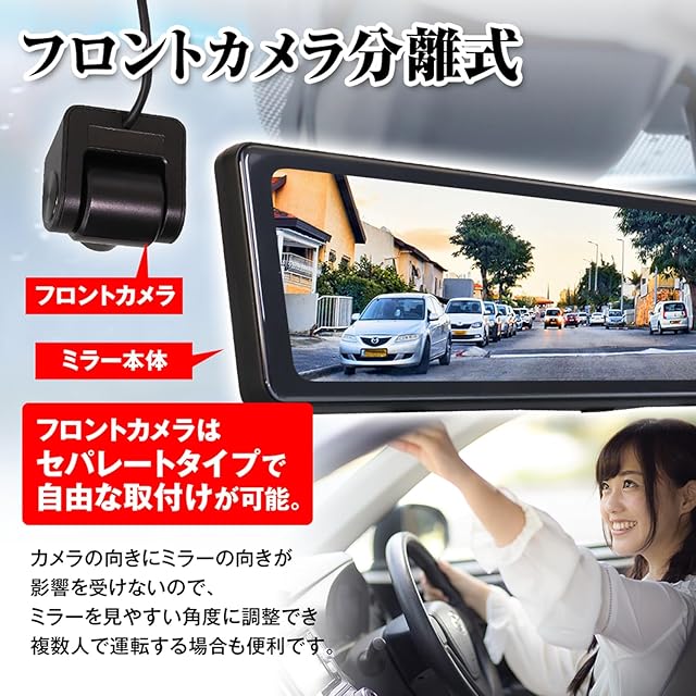 【バンド式装着タイプで初の60fpsを実現!】 フロントカメラがセパレート、リアカメラは拡大・縮小機能搭載 リアカメラに60psを採用。非常に滑らかな映像を録画可能。またフロントカメラは分離式なので、 カメラの向きに影響を受けることなく、ミラー本体をお好みの角度に調節可能。 リアカメラには拡大・縮小機能も搭載し、距離感がつかみやすくなります。