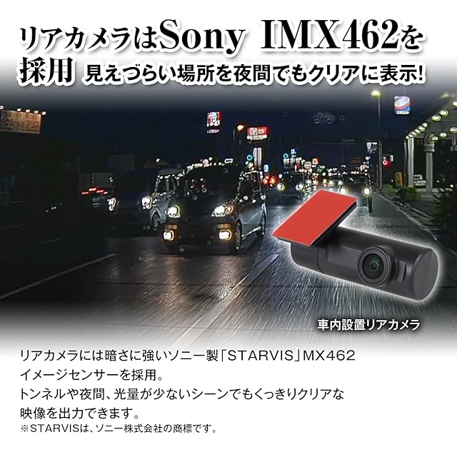 【リアカメラはSONY IMX462を採用】 リアカメラには暗さに強いソニー製「STARVIS」MX462イメージセンサーを採用。 トンネルや夜間、光量が少ないシーンでもくっきりクリアな映像を出力可能。 ※STARVISは、ソニー株式会社の商標です。