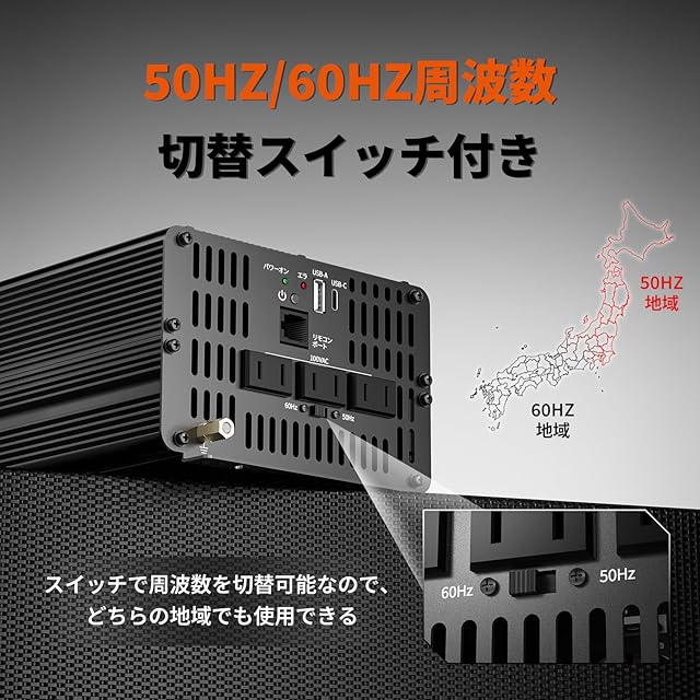 【5台の機器へ同時に給電可能】LiTime 1000W正弦波インバーターは、3つの100V ACコンセント、1つのUSB‐Aと1つのUSB-C出力ポートがあり、多様な出力ポートで最大5台の機器へ同時に給電でき、様々な使用需要を満たします。スイッチにより、50Hz/60Hz周波数切替可能で、どちらの地域でも活用できます。