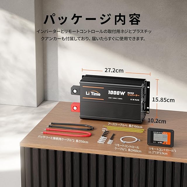 【便利なリモート管理を実現】LiTime 12V1000W 正弦波インバーターは、リモートコントロールモジュールが付いています。リモコンモジュールのLCDスクリーンではDC入力電圧、バッテリー残量、周波数、AC出力電圧、出力電力等の情報を表示して、ボタンでインバーターをオン/オフすることも可能で、状況を素早く把握できるため、万が一のトラブル時にも迅速な対応ができます。リモートコントロールケーブルの長さは450cmで、使用需要に応じてインバーターとリモートコントロールを取り付けて、離れたところからも便利に管理できます。
