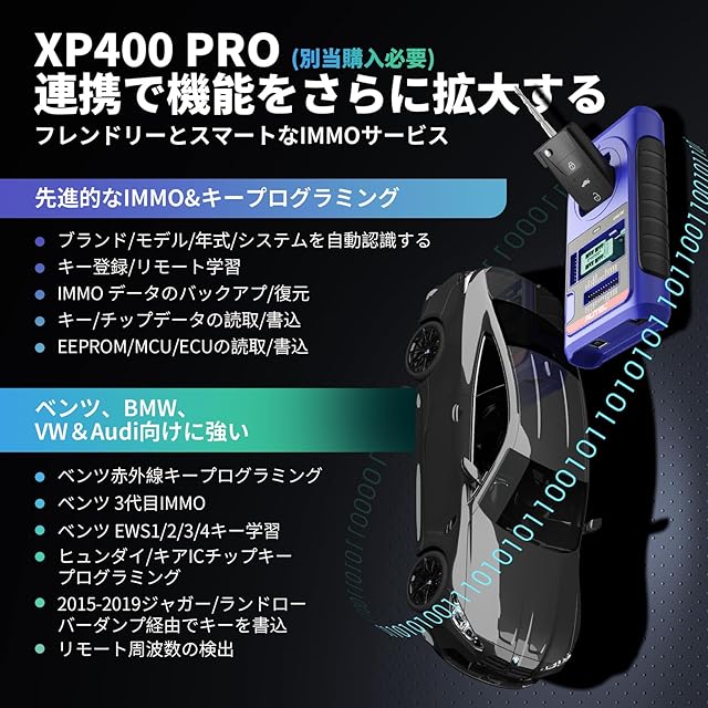 【XP400Proキープログラマーに対応】(別途購入) より高度なスキャナーに3000ドル以上を支払う必要はありませんが、IM608 Proと同じIMMOとキーフォブプログラミング機能を楽しむことができます。 XP400 Proに接続すると、IM508はBMW CAS4キー学習などのIMMO機能をサポートする機能を拡張できます。✅IMMO ECU読み取り&書き込み、MC9S12暗号化チップ読み取り&書き込み、ICカード読み取り&書き込み、メルセデス赤外線K~y読み取り&書き込み、リモート周波数検出などのプログラミング機能をサポートします。