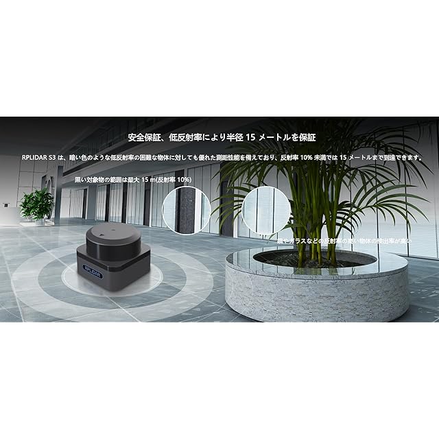 【優れた測距性能】RPLIDAR S3 は、暗い色のような低反射率の困難な物体に対しても優れた測距性能を備えており、反射率 10% 未満では 15 メートルまで到達できます。