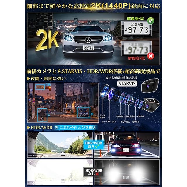 【画質NO1:2K(1440P)高解像度技術を採用するドライブレコーダー ミラー型】従来機種のフルHD(1920x1080)からさらに解像度を高め、まるでカメラで撮影したような高画質。新開発高精細1920*480(pixel)IPS液晶モニターを採用し、従来品より高品質な発色と広い視野角を両立します。高画質で大事なシーンを逃さない。●【暗視機能NO1:前後ともにSTARVIS搭載+HDR/WDR機能】明るく低ノイズで色再現性に優れる新採用のソニー製CMOSセンサーや、明暗差の大きいシーンも安定した映像で撮影できるHDR/WDR機能+業界トップクラス大口経F1.8レンズを採用で、特に夜間の白飛びや暗所つぶれを減らし、高画質を実現しています。裸眼よりも視認性が高いです。