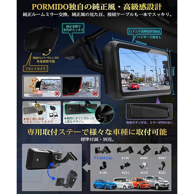 【全く新しいデザイン、さらなる純正風と高級感へ】車種専用設計。純正ミラー交換型だからスッキリ美しい仕上がり。車室内に溶け込む美しい外観、純正品と交換しても違和感がないです。●【配線1本のみ・純正風に装着できるフロントカメラステーと配線カバー付属】従来のミラー型ドラレコは、本体上部にカメラ・電源・GPSなど数本のケーブルを接続するため配線が目立ってしまう問題がありました。本製品は本体より出る配線は1本のみと非常にシンプル。付属の専用配線カバーとフロントカメラステーを利用して配線が露出しないような美しい取付が可能。●【どの車種にも対応する11インチタッチパネル液晶】デジタルミラーのスクリーンは11インチの大画面。装着後でもバイザーを使用できます。