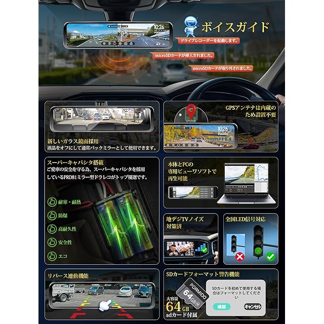 【機能は純正以上】◆【常時録画/衝撃録画/手動録画/静止画記録/駐車監視録画/音声記録】5つのモードで前方・後方を同時録画録音。エンジンONで高速録画!画面オフにしても、バックミラーとして使えます。◆録画されたファイルの万が一の破損を防ぐ「スーパーキャパシター」を搭載。◆【本機で映像チェック可能】パソコンはもちろん、本機でも記録した映像をその場で確認できます。◆大容量64GBmicroSDカード付属(Class10以上の8~128GBのmicroSDカードに対応しています)◆SDカードチェック機能付き。◆音声ガイダンス機能付き。【ドライブの様々なシーンを想定した、高い信頼性】電源断対応、耐寒・耐熱、耐衝撃、耐静電気、防爆。車室内を想定した耐久試験もクリアした堅牢設計のため、安心して使用できます。