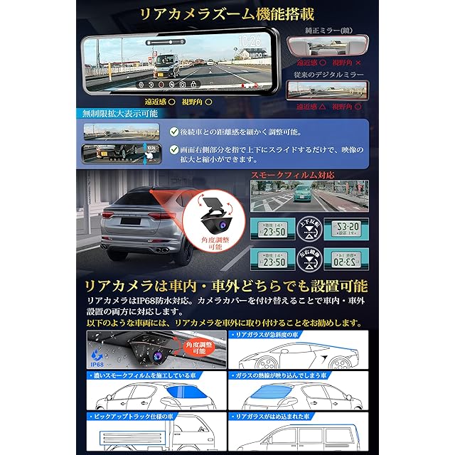 【リアカメラは車内・車外どちらでも設置可能】リアカメラはIP68防水対応。カメラカバーを付け替えることで車内・車外設置の両方に対応します。以下のような車両には、リアカメラを車外に取り付けることをお勧めします。(濃いスモークフィルムを施工している車/リアガラスが急斜度の車 /ガラスの熱線が映り込んでしまう車/ピックアップトラック仕様の車/リアガラスがはめ込まれた車)。●【ズーム機能搭載】ズーム機能によりドアミラーの見え方と後方カメラ画像の大きさをピッタリと合わせることができて、安全性アップ。●【フロントカメラ分離式設計】より多くの車種や最適な場所に設置可能。車両ADASユニットが録画映像に映り込むことを回避します。自動ブレーキシステム搭載車にも対応!