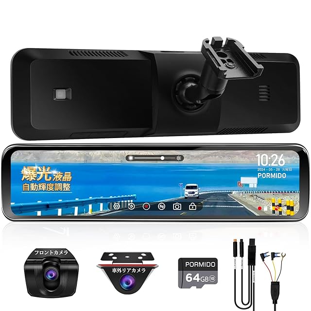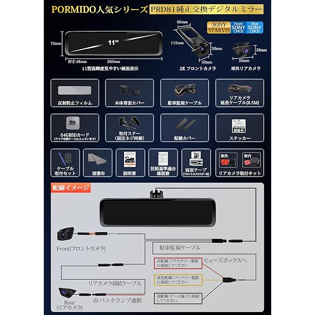PORMIDO 爆光デジタルインナーミラー2K【11インチ爆光液晶/自動輝度調整付】【ドライブレコーダーミラー型 純正交換タイプ :ズーム/ソニー製STARVIS/3軸Gセンサー/配線隠し・配線一本のみ/美しい純正感】ドライブレコーダー 前後カメラ 分離式 GPS内蔵 72時間駐車監視 HDR/WDR搭載 LED信号機スモークガラス車に対応 ドラレコミラー型 車内/車外リアカメラ【PRD81】