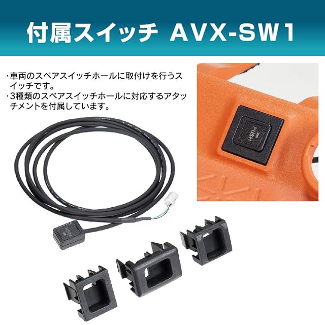 オプションスイッチ付き(AVX-SW1)なのでステアリングスイッチの無いGRスポーツ系の車種や一部のディスプレイオーディオ付車にAVXシリーズが適合します。TOYOTA車のスペアスイッチホールに装着するアタッチメントを付属しています。 スペアスイッチホールは、車種や場所により大きさが異なります。3種類のうち、大きさの合うアタッチメントを使用してください