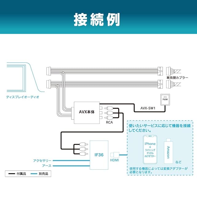 ビートソニックが開発した外部入力アダプターを使うことによって、ディスプレイオーディオに映像と音声の入力が可能になります。これにより不可能だと思われてきたiPhoneをつないでのミラーリングやFireTVをつないでの動画配信サービスの視聴が可能になります!(iPhoneやFireTVを接続する場合は映像変換器やミラーリングキットと合わせてご利用ください。)