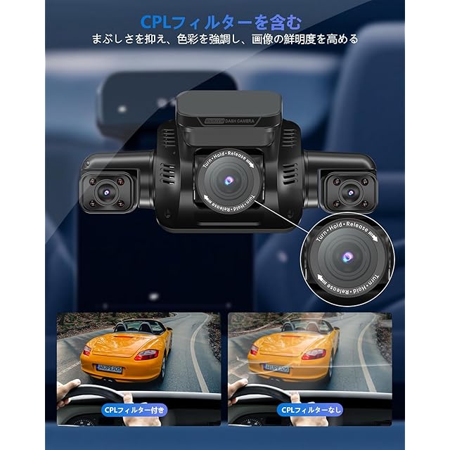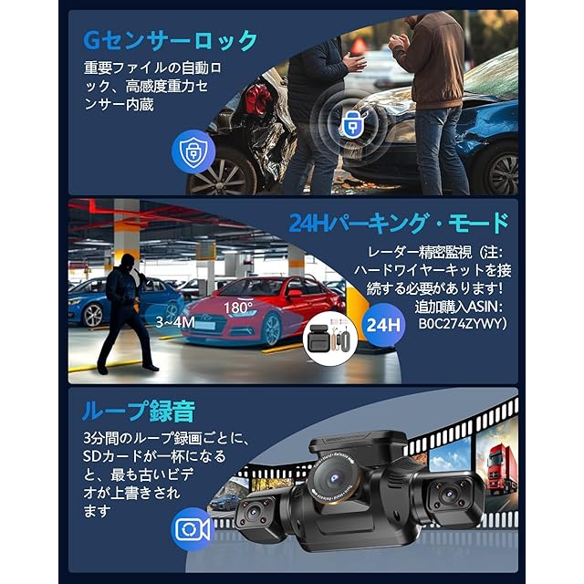 【ユニークなブラケット隠しデザイン】視野を邪魔しないデザインを採用、 3インチ150°広角 レンズは5車線幅の道路でも死角のない映像を記録することが可能です。4カメラどちらも150°超大広角。 視野角は広く、音声記録で事故の発生状況を客観的に判断できます。