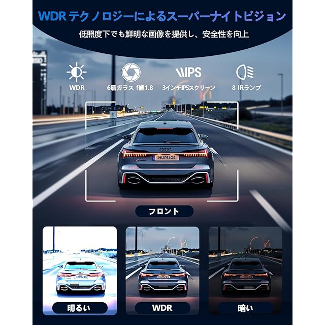 【スーパーナイトビジョン機能】 HUPEJOS V8PLUSドライブレコーダー8LED赤外線とWDR(ワイドダイナミックレンジ)を搭載し、極端な明暗差のある状況や逆光、夜間撮影時に発生する白黒のブレを抑え、より鮮明でクリアな映像を映し出します。