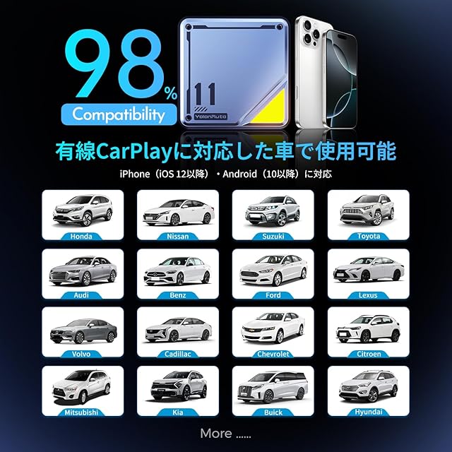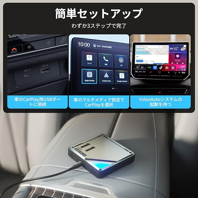 【有線CarPlay対応車にそのまま使える】お使いの車に有線CarPlay機能が搭載されていれば、本製品はそのまま使用できます。特別な設定や工事は不要で、USBポートに差し込むだけの簡単接続。※一部の車種ではCarPlayが非対応、または無線専用の場合があります。ご購入前に、有線CarPlay対応であることをご確認ください。