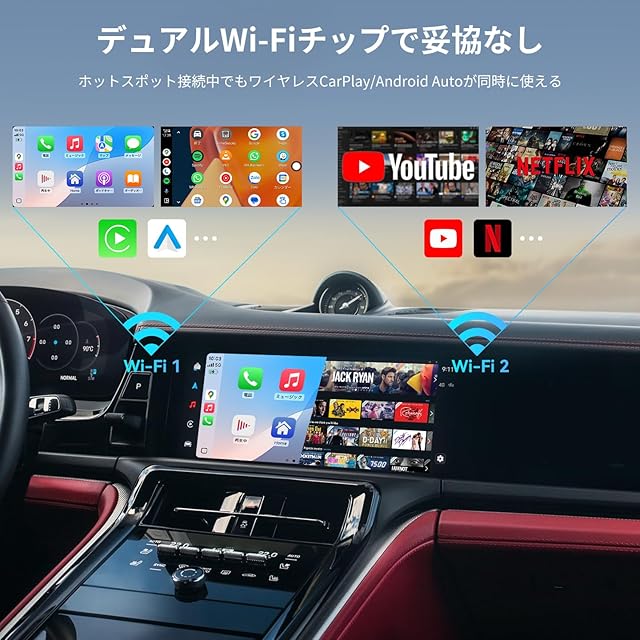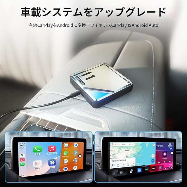 【CarPlayワイヤレス化対応・Android AutoもOK】ワイヤレスでスマホを車に接続。iPhone・Android問わずBluetoothで簡単ミラーリングが可能。スマホのBluetoothをオフにすると接続が即座に解除され、Androidシステムにスムーズに切り替わります。Bluetooth通話や音楽再生も快適にサポートし、操作の自由度が大幅にアップします。