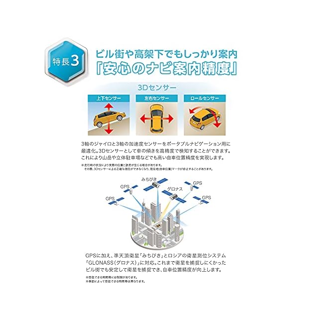 自社位置精度を高める3Dセンサー&3種の衛星受信を搭載。【3Dセンサー】ジャイロ3軸&加速度3軸の高精度3Dセンサー搭載で高架下などの測位しずらい場所での精度が向上し、高い自車位置精度で走行できます。 【3種の衛星受信】GPSに加え、みちびきとグロナスにも対応。