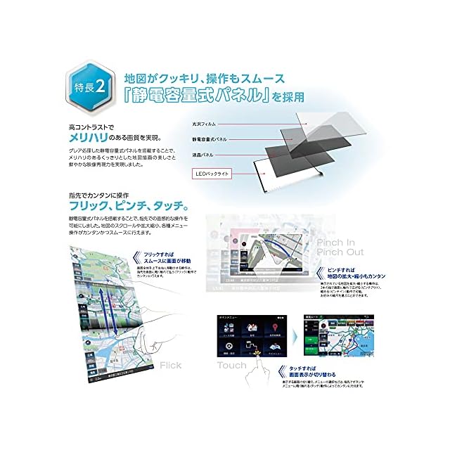 地図がはっきりクッキリ見やすく、スマホのようなフリックやピンチイン/アウトで指先でカンタンにスムーズに操作できる静電容量式パネルを採用。