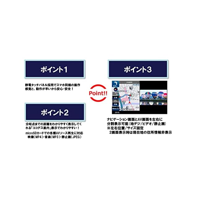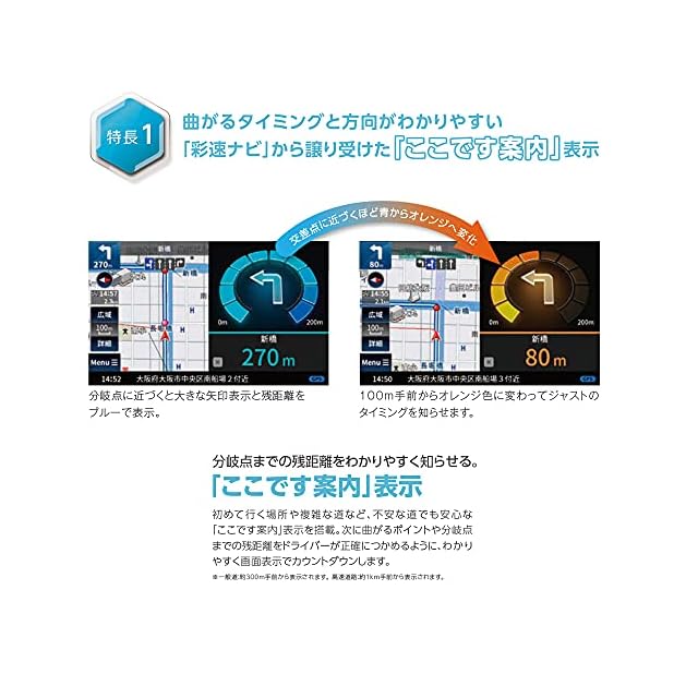 見やすさと分かりやすさを徹底追及。地図データーは彩速ナビで実績のあるインクリメントP社の地図を採用。3D交差点イラストや市街図で見やすい。メニュー画面もアイコンが大きくわかりやすい。また、逆送の発生しやすい高速道路のサービスエリア・パーキングエリアで本体の電源をONにした際に画面で注意を促します。地図更新はできません。