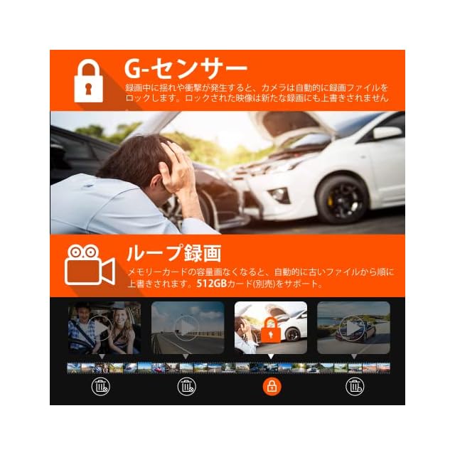 【多機能 Gセンサー ループ録画 タイムラプス撮影 】G-sensor機能/ループ録画/ タイムラプス撮影/GPS機能/駐車監視/LED信号機対応など機能が満載です。★高感度のGセンサー機能搭載により、録画中に揺れや衝撃が発生すると、自動的に録画ファイルをロックします。ロックされた映像は新たなビデオに上書きされないです。事故の証拠をしっかりと残しておきます。Gセンサーの感度を調整可能です。★ループ録画機能を設定すれば、メモリーカードの容量がいっぱいになると自動に古い動画ファイルから順に新しい動画に上書きされます。★タイムラプス撮影は1秒間に1枚のみ記録することで長時間の記録が行えます。★最大512GBのMicroSDカード(別売)に対応。書き込み速度U3またはU3以上のメモリーカード(正規品、大手メーカ)を使用してください。VANTRUE製のドライブレコーダー専用のmicroSDカード(B081G8Y23H、B081GJK4S4)をすすめます。品質が良くないカードを使用する場合、エラーが発生する可能があります。
