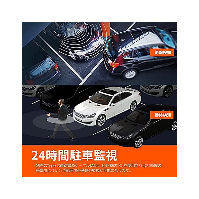 【24時間駐車監視 動体検知 衝撃検知 5種類駐車モード 小型】別売のType C直結電源ケーブル(ASIN: B094882TJC、B0C7QS98BB、B0B7NGCTGQ)を使用すれば24時間監視が可能になります。ご注意:VANTRUE 直結電源に低電圧保護機能があるため、設定した数値よりまで下がった場合、自動にドラレコの電源を切ります。本機には5種類駐車監視モードが選択できます。※衝撃+動体検知で、待機状態(パワーON)で動体や衝撃を検知して自動に録画します。※衝撃検知(低消費電力)で、駐車の場合(パワーOFF)で衝突を検知して自動に起動して記録します(Gセンサーを設定する必要があります)。※動体検知:駐車時には動きをフロントと車内カメラが感知して記録します。※低ビットレート録画:720P@15FPSの解像度で録画します。エンジンを切っているときもドライブレコーダーが監視を続け、駐車時の当て逃げや車上荒らしなども安心です。※タイムラプス撮影(省スペース):「低速度撮影」と呼ばれ、数秒に1コマずつ撮影したものを繋げて再生することで、コマ送り動画のように見える撮影方法です。