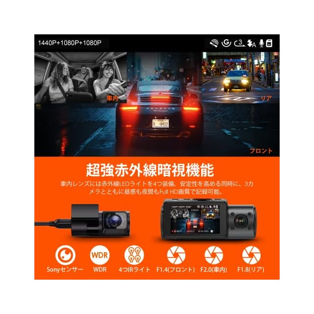 【超強暗視機能 赤外線 WDR ドラレコ】N4ドラレコは3カメラとも夜間の撮影に強いSONY製CMOSセンサー 「STARVIS」を採用し、超明るい業界最大口径F1.4(フロント)、F1.8(車内)とF2.0(リア)レンズで、高性能レンズとCMOSセンサーの相乗効果で暗いトンネルや夜でもキレイに録れるフルハイビジョン録画対応のドライブレコーダーです。夜間に運転することが多い人のマストアイテムです。更に、車内レンズには赤外線LEDライトを4つ装備。夜間走行時に暗くなってしまう車内も、ドライバーの表情が分かる明度での撮影を実現しています。画像補正のWDR機能を搭載で、夜間でもキレイに記録できるだけでなく、白とびや黒つぶれ、 逆光にも強い為、トンネルでの明暗さなどもしっかり補正し、キレイな映像を記録します。