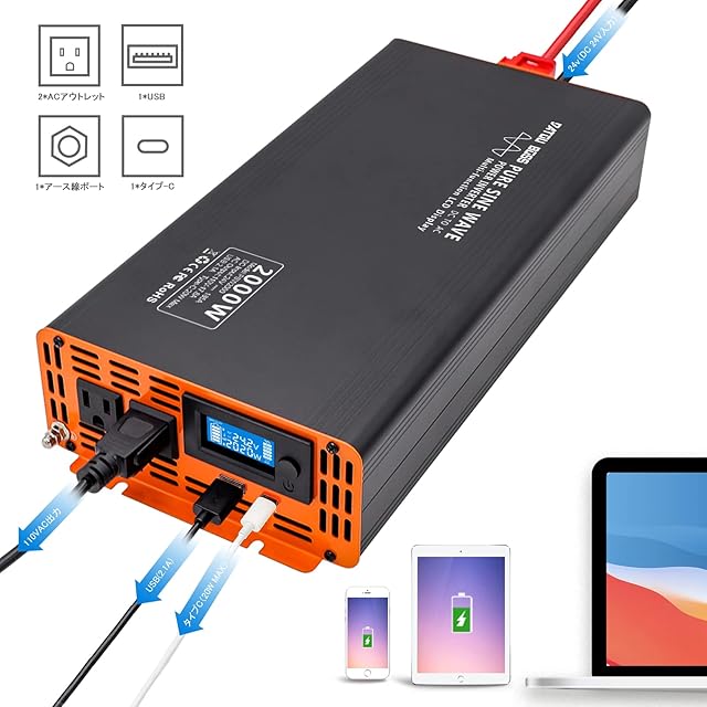 DATOUBOSS インバーター 正弦波 24V 2000W 純正弦波 インバーター DC 24VをAC 100Vに変換 3口出力ソケット×2、USBソケット×1、Type-C×1 カーインバーター, 最大4000W LCD液晶ディスプレイ リモコン付き (2000W-24V)