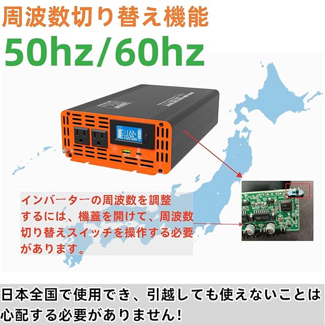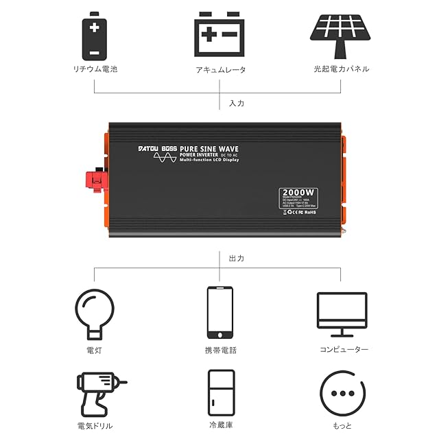 【高性能の純正弦波インバーター】:純粋な正弦波出力で多数の電気製品、精密機器にもOKです!MCUマイクロプロセッシングによってコントロールされるSPWM技術で、100% 1000wの正弦波電力を提供できます。インバーターの変換効率は90%以上に達しています。