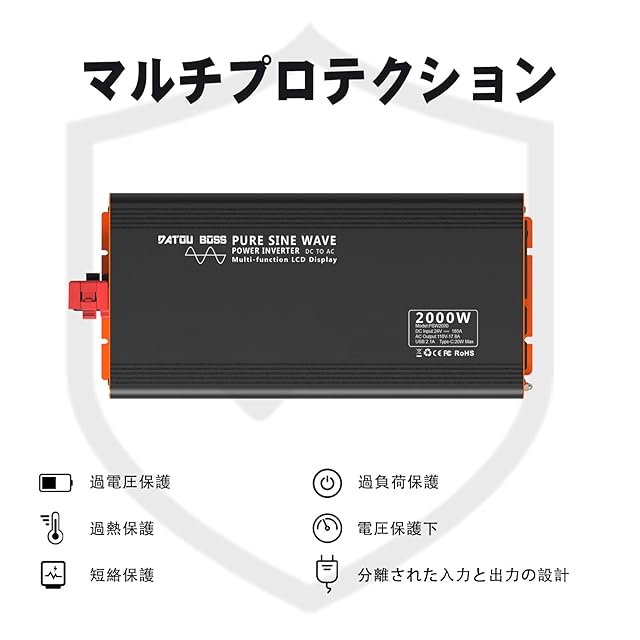 【多重回路保護】入力低電圧アラムー、過電圧保護、過負荷保護、低電圧保護、過熱保護、短絡保護。ご使用している回路を完全に守られます。歪み率は非常に低いです。波形THD:≤3%。
