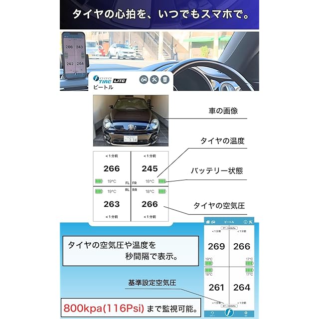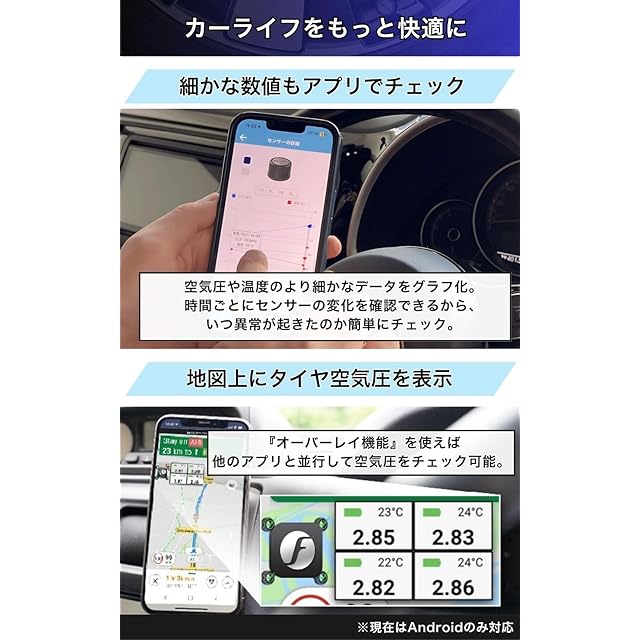 ✅【タイヤの心拍をいつでもスマホで。】タイヤの空気圧や温度がリアルタイムで表示されるから、お出かけ前にスマホでサッとチェックできます。 800kpaまで監視可能で、圧力単位(kPa/psi/bar/ksc)の変更にも対応。✅【瞬時に異常をキャッチ】タイヤの空気圧が規定値を下回ったり、上回ったりした場合は警告音とスマホ画面で即時にお知らせ。 他のアプリを使用中でも通知が来るから危険を見逃しません!